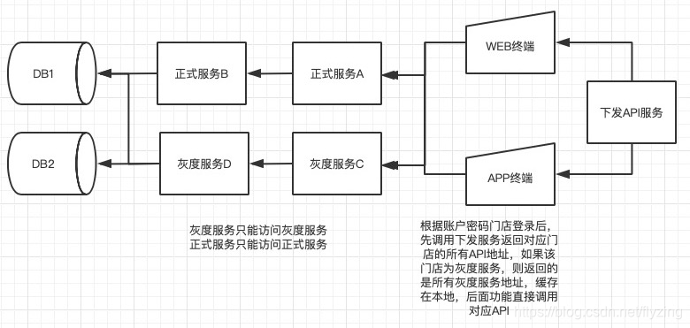 终端登录后,如果是灰度门店,调用下发API服务获取所有灰度API地址。终端直连灰度服务。