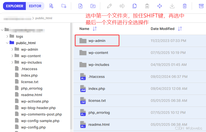 进到网站根目录,通过shift 键来全选所有的网站文件: