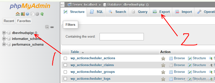 进去之后,要先选中数据库,也就是下图中的1,然后再Export (图中2)