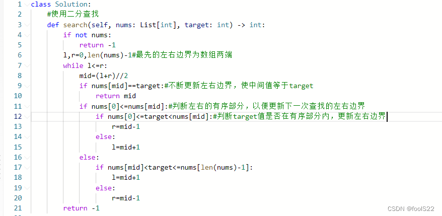 我们可以在常规二分查找的时候查看当前 mid 为分割位置分割出来的两个部分 [l, mid] 和 [mid + 1, r] 哪个部分是有序的,并根据有序的那个部分确定我们该如何改变二分查找的上下界,因为我们能够根据有序的那部分判断出 target 在不在这个部分: