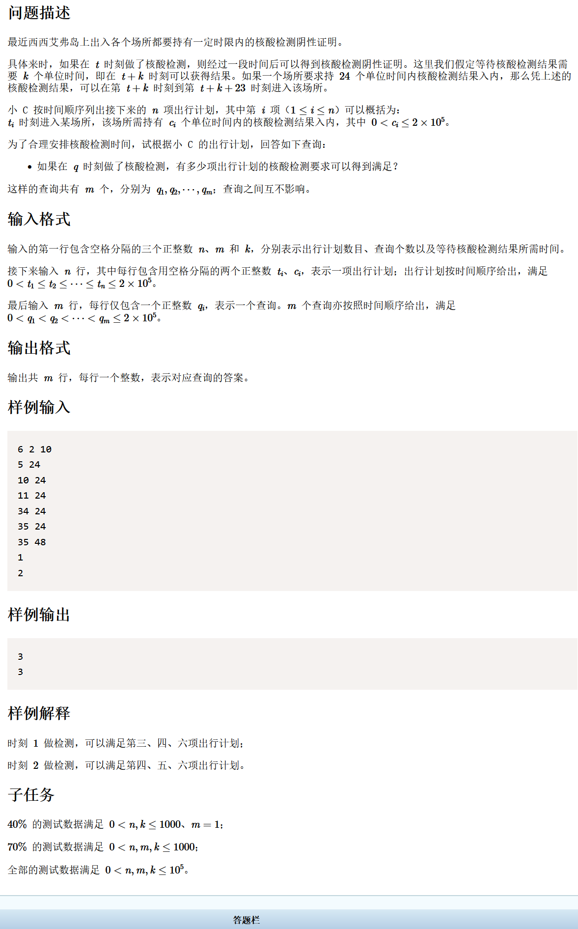 该程序使用C++编写,通过差分数组存储每个时刻能做的核酸检测计划数。输入包括出行的次数、每条计划的出行时间和允许时间,计算在给定时间内能完成的核酸检测计划。程序首先更新差分数组,然后计算前缀和以快速查询特定时刻的计划数。