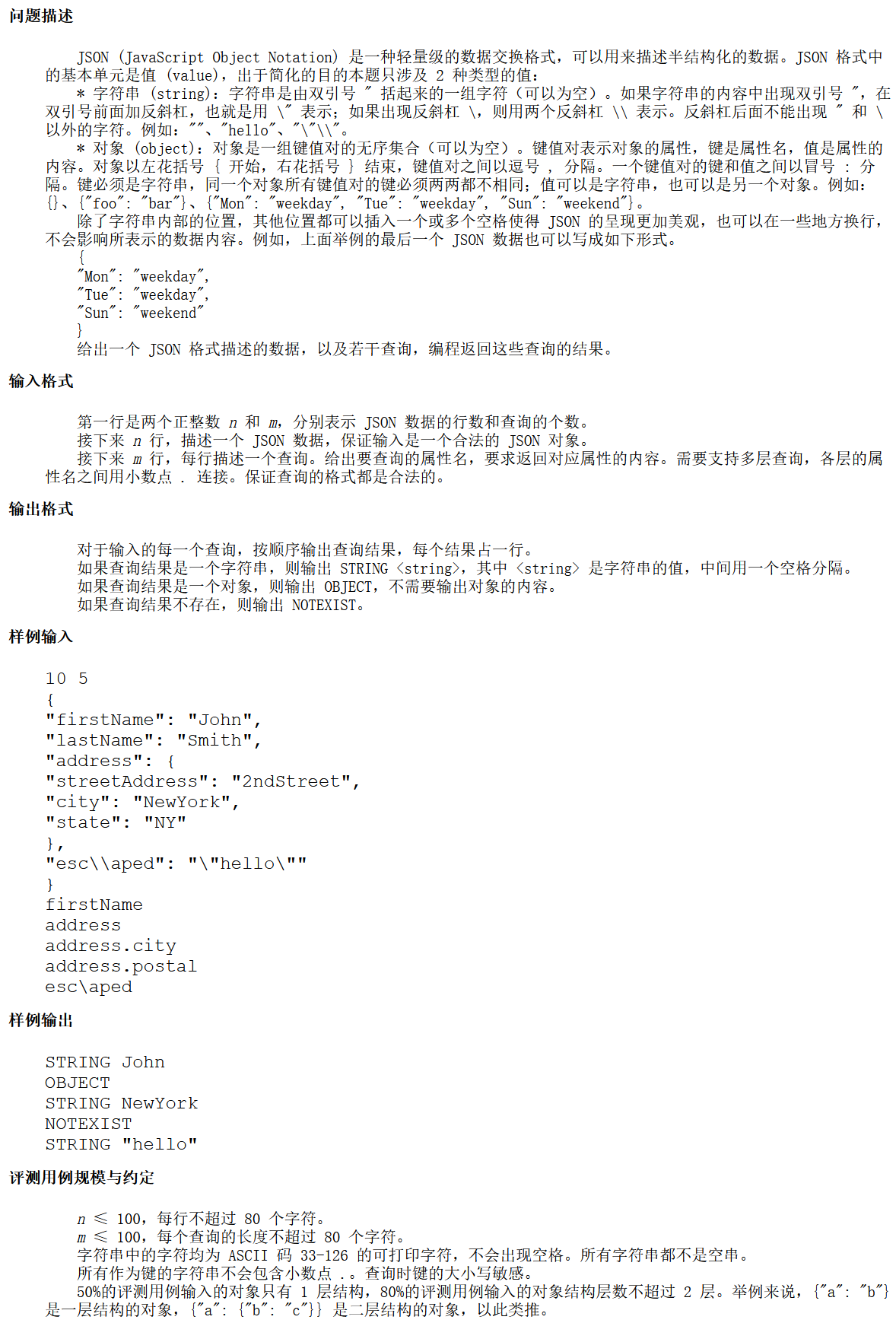 该代码实现了一个解析器,用于处理包含键值对(key-valuepairs)和嵌套对象的字符串输入。它使用一个map来存储完整的路径作为key,对象或值作为value。当遇到对象时,路径会更新,退出对象时则会修剪路径。程序还提供了查询特定路径是否存在及其对应值的功能。