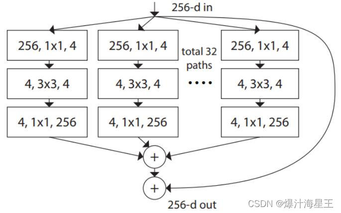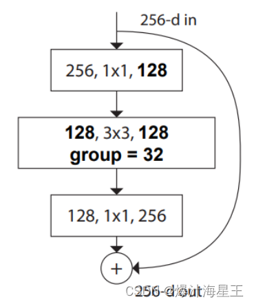 ResNeXt将残差分为若干个支路,左图所示的结果在计算上等效于右图,右图就是分组卷积,将32个通道为一组使用一个卷积核,每组之间不共享权值。这样做可以减少参数量,加快网络速度,同时分组卷积相比普通的卷积并不会使模型效果更差。