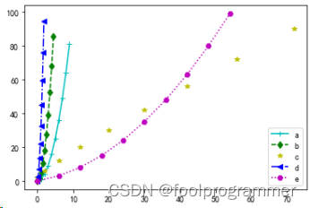 这段代码展示了如何利用numpy生成数据,并用matplotlib库在同一个绘图区域绘制五条不同颜色和样式的曲线,包括直线、虚线、星号、箭头和横线,用于数据的对比和展示。