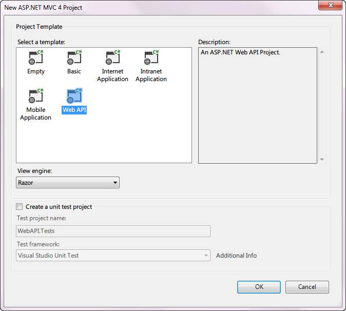 在安装了Visual Studio 2012后,我们依次点击新建项目->已安装模板->Web->ASP.NET MVC 4 Web Application新建一个工程项目。