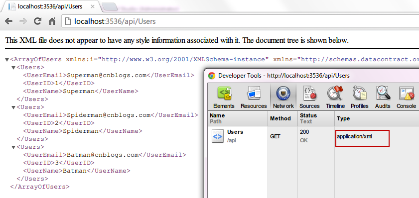 先使用Chrome请求,我们发现HTTP Header里面的Content-Type是xml类型。