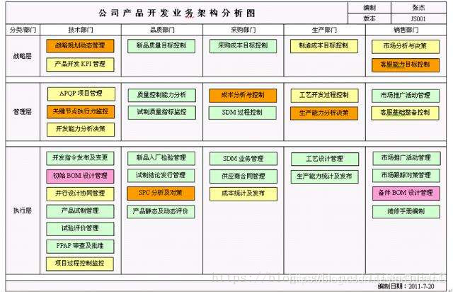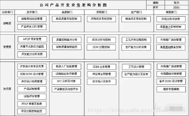 如典型的整车生产企业产品开发业务的业务架构示意图所示:当我们对于某项典型业务的业务组件的构成进行初步的归纳后,能够得到该项业务的一个整体的框架结构,我们可以称之为“业务架构图”,以及在这个框架内,企业中三个层级的员工在该项业务上分别从事着哪些作业内容。分析执行层的业务作业方式和作业规律,你觉得很正常,但如果让你去分析作为你上司的管理层、甚至决策层的作业方式和作业规律时,你也许会感到有所不安。这种心理反应,实际上正好反映出目前很多企业中的一种能力倒置现象的产生原因。很多人都了解这样的事实,那就是,企业中的很多升职后的中高层领导,在就位后的很长时间内,不能进入应有的管理角色中,这绝对不只是个人能力的差异问题,而主要是因为我们的中高层领导总是习惯地认为:研究执行层的作业方式和规律才是他们的主要职责,而没有注意到自己的作业内容和作业方式在整个作业链条中的重要作用,其结果,自然是管理层和决策层领导们的业绩,只好取决于执行层作业人员的努力程度,这种习惯也导致我们的中高层领导们不会去研究影响自己判断能力和决策能力的技术瓶颈是什么。而很多新出现的现代管理模式,实际上就是为了解决中高层领导们的作业能力问题,或是为了解决三个业务层级之间的信息沟通能力的问题,这也就是为什么业务架构分析人员还必须分析战略层和管理层作业形态的原因。下面将分别说明上述三个不同层次作业组件的特点: