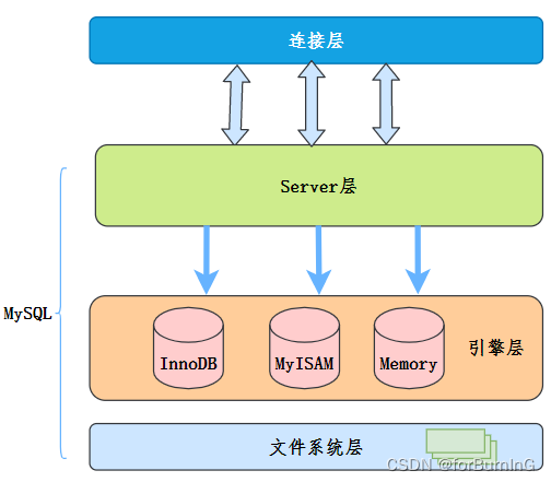 MySQL服务层负责SQL语法解析、生成执行计划等,并调用存储引擎层去执行数据的存储和检索。