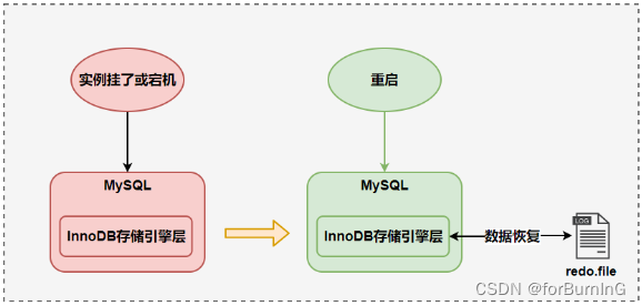比如 MySQL 实例挂了或宕机了,重启时,InnoDB存储引擎会使用redo log恢复数据,保证数据的持久性与完整性。