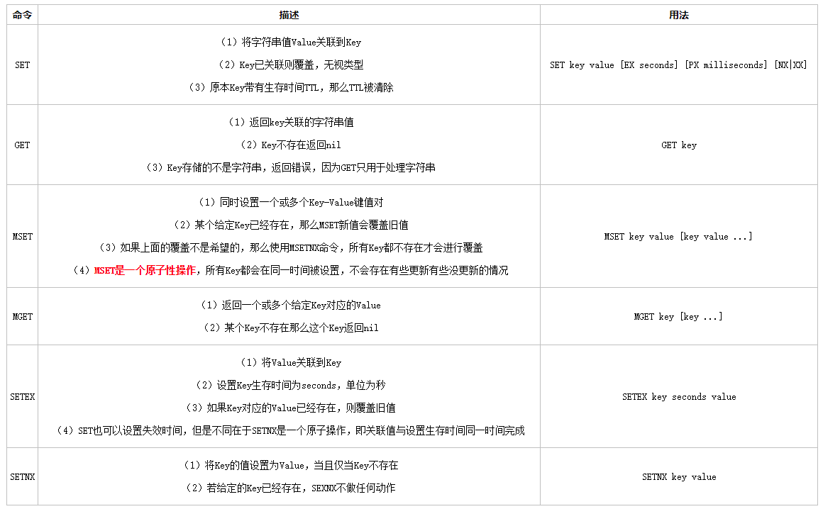 string 数据类型在 Redis 中的相关命令: