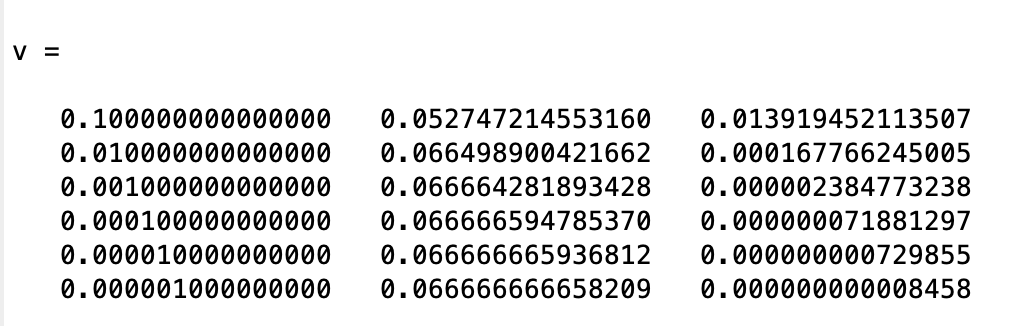 结果的解释:第一列为不同的步长,第二列为对应求出的积分值,第三列为与标准积分结果的差值。