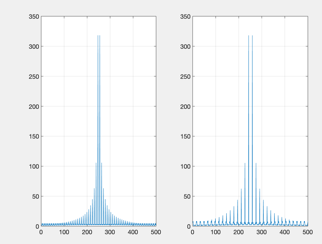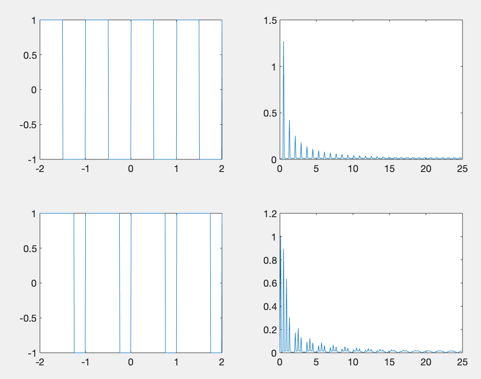 - 第一行的图占空比50%,第二行的图占空比75%,脉冲宽度增加,谱线变得稠密