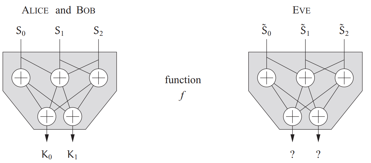 在该图中,Alice,Bob和Eve都可以对各自的序列S与执行函数f的操作。其中