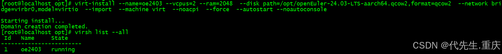 [root@localhost opt]# virt-install --name=oe2403 --vcpus=2 --ram=2048 --disk path=/opt/openEuler-24.03-LTS-aarch64.qcow2,format=qcow2 --network bridge=virbr0,model=virtio --import --machine virt --noacpi --force --autostart --noautoconsole