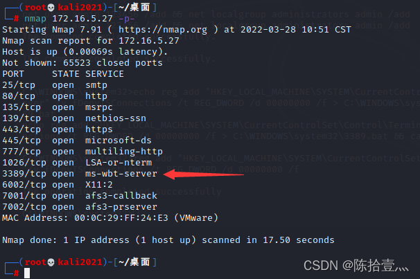 最后再次nmap扫描发现靶机成功开启了3389端口,我们就可以远程连接了