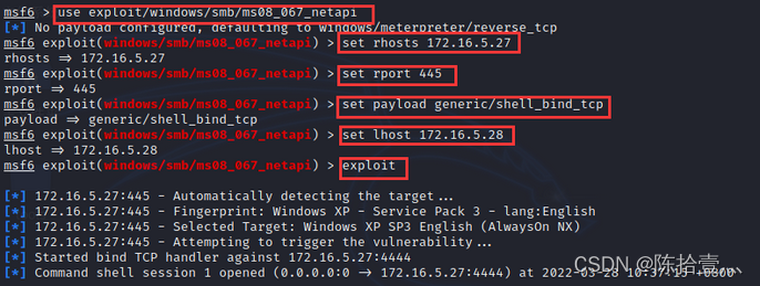 利用msfconsole控制台的exploit/windows/smb/ms08_067_netapi攻击模块对靶机445端口的攻击过程,成功进入后渗透,开启靶机的3389远程登录
