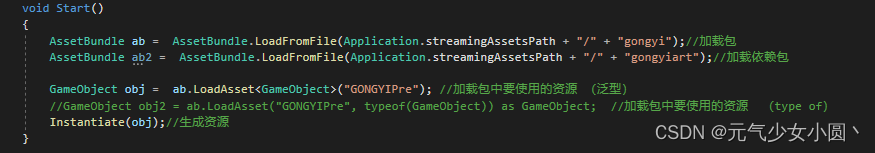 //GameObject obj2 = ab.LoadAsset("GONGYIPre", typeof(GameObject)) as GameObject; //加载包中要使用的资源 (type of)