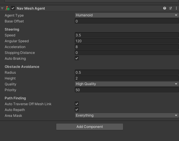 给需要寻路的物体添加Nav Mesh Agent组件