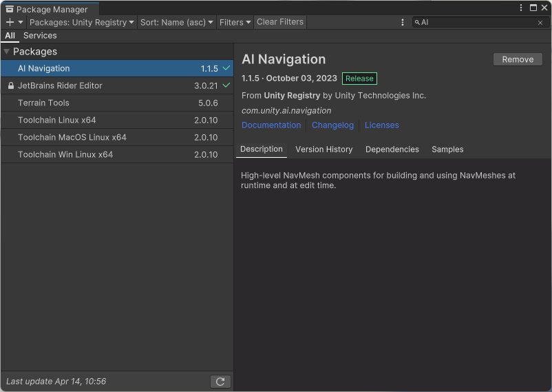1.创建工程。在Package Manager中导入AI Navigation