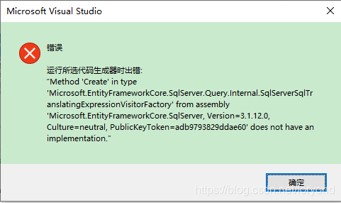 抽出主要单词就是Create函数没有找到实现,出错了,错误原因是项目安装的EntityFramework的NuGet包版本不一致,解决方法是: