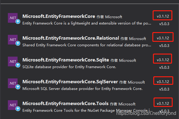 方法一:工具——NuGet包管理器——管理解决方案的NuGet程序包——已安装,保证所有EntityFrameworkCore的包版本一致,如图: