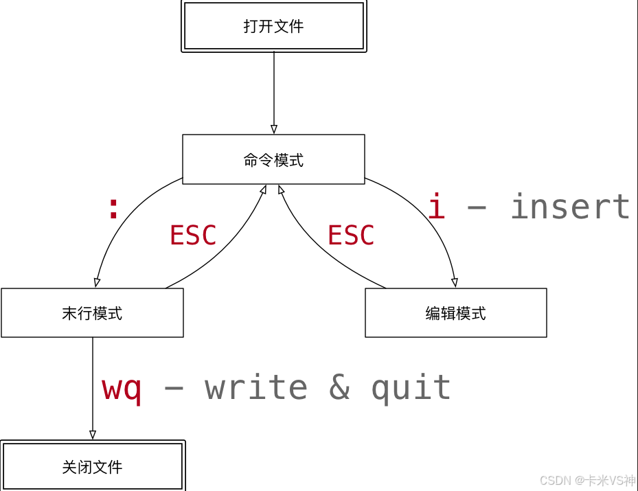 - 打开文件首先进入命令模式,是使用vi的入口