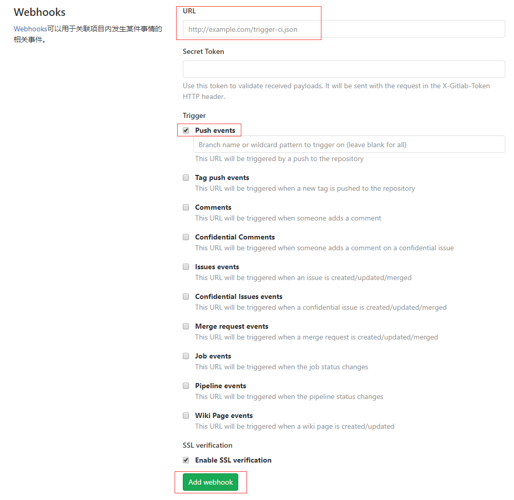 进入GitLab后台系统,点击要配置的仓库项目,进入设置 -> Webhooks,链接框中填入上面Jenkins提供的URL,勾选Push events,点击Add webhook。