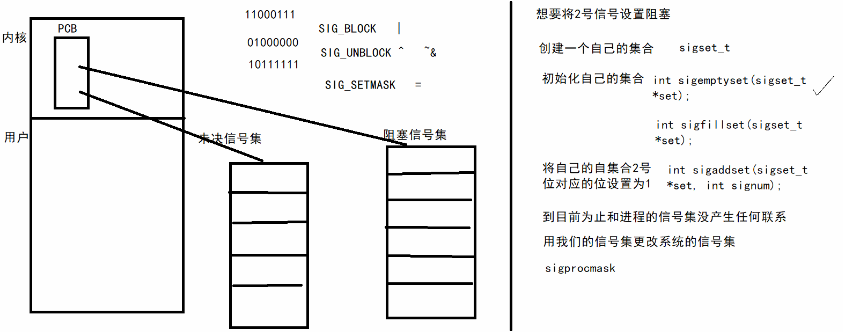 阻塞信号集(信号屏蔽字):将某些信号加入集合 对他们设置屏蔽,当屏蔽 x 信号后,再收到该信号,该信号的处理将推后(解除屏蔽后):修改阻塞信号集,造成某些信号的阻塞(暂时不处理某些信号)