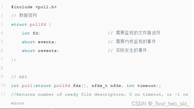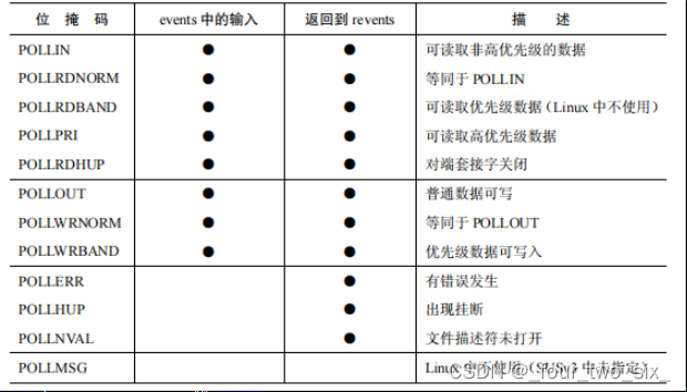 做检查的事件。当poll()返回时,revents被设定以此来表示该文件描述符上事件发生的事件。