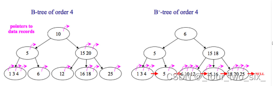 B+树的叶子节点有一条链相连,而B树的叶子节点各自独立。