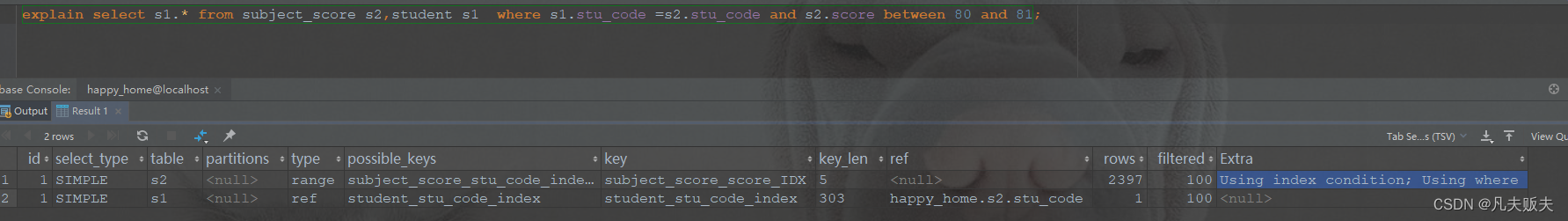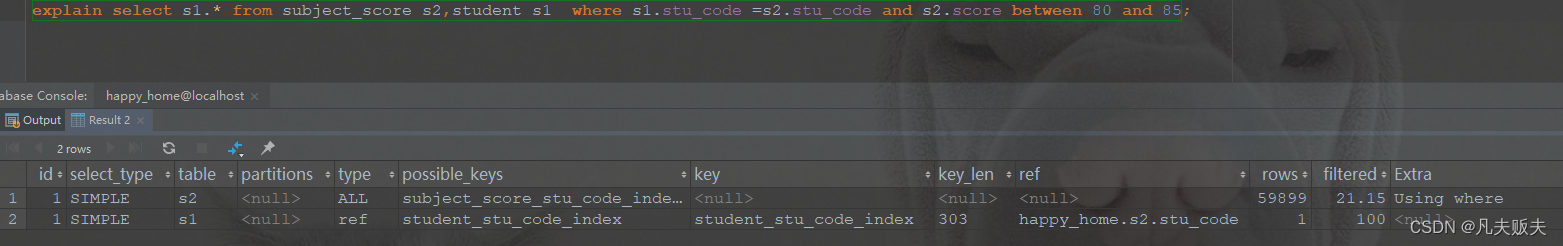 因此explain是一个好东西,建议仔细研究。再举个例子,下面sql是查询学生分数,当需要扫描的行数比较多的时候,即便score(分数)创建的有索引,mysql的执行计划会放弃索引,直接进行全表扫描。当需要扫描较少的行数的时候,索引才会起作用。所以,如果不分析问题,直接创建索引未必就能解决性能问题。
