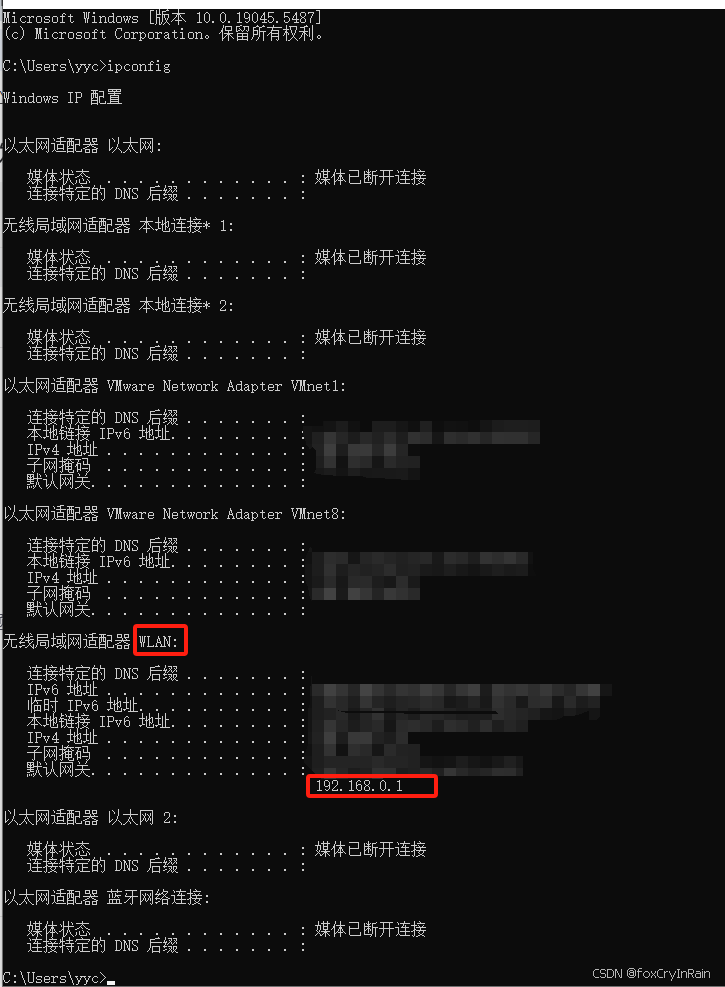 连接WiFi盒子后 在Windows上打开cmd窗口输入ipconfig