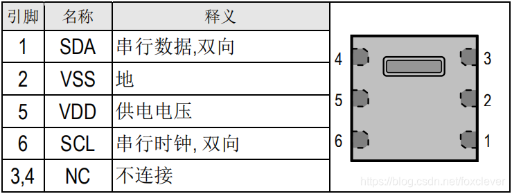 SHT2x湿度和温度传感器采用了新的封装模式和数字接口,每一个传感器都经过校准和测试。在产品表面印有产品批号,同时在芯片内存储了电子识别码-可以通过输入命令读出这些识别码。此外,SHT2x温湿度传感器的分辨率可以通过输入命令进行改变(8/12bit乃至12/14bit的RH/T),传感器可以检测到电池低电量 状态,并且输出校验和,有助于提高通信的可靠性。SHT2x温湿度传感器的封装及引脚定义如下图: