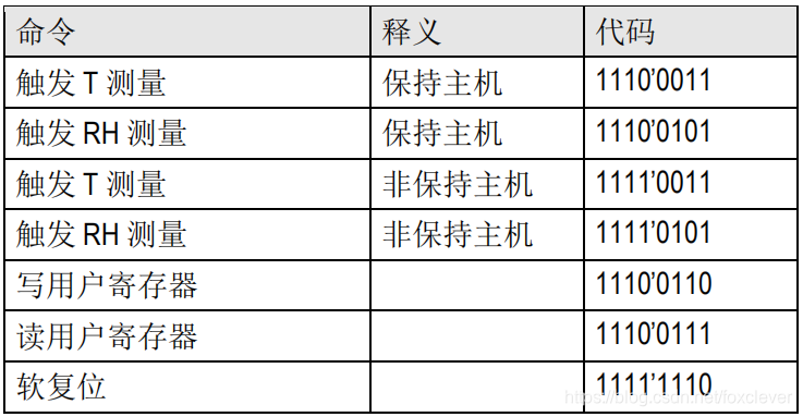 SHT2x温湿度传感器采用标准的 I2C协议进行通讯。在启动传输后,随后传输的I2C首字节包括 7位的I2C设备地址(B-范例地址“1000’000”)和一个SDA方向位(读 R:“1”,写 W:“0”)。在第 8个SCL时钟下降沿之后,通过拉低 SDA引脚(ACK位),指示传感器数据接收正常。在发出测量命令之后(“1110’0011”代表温度测量,“1110’0101”代表相对湿度测量),MCU必须等待测量完成。基本的命令列表如下: