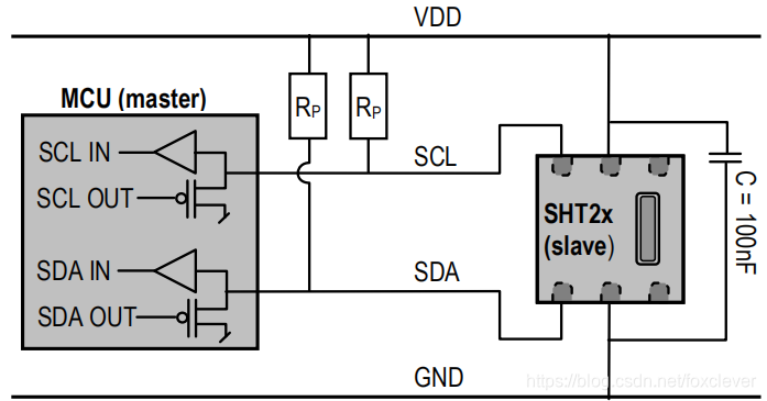 SHT2x 温湿度传感器的供电范围为 2.1-3.6V,推荐电压为 3.0V。电源(VDD)和接地(VSS)之间须连接一个100nF的去耦电容,且电容的位置应尽可能靠近传感器。数字接口为标准I2C总线。接线方式如下图: