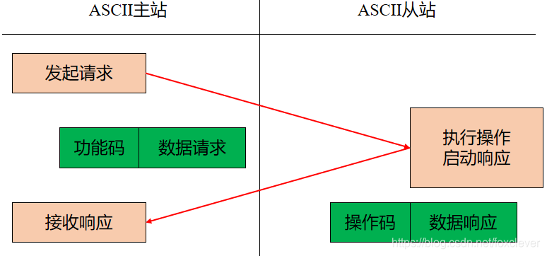 对于ASCII从站来说,它会生成数据,但他不会主动向外发送数据,只有当收到主站的数据请求后,从站才会根据主站的请求发送数据。这一过程如下图所示: