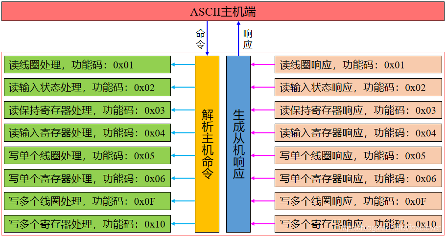 我们规定了每类数据类型的数量为8,对于从站来说除了生成这些数据外,还需要根据主站的数据请求来返回相应的数据响应。在我们的协议栈中实现了0x01、0x02、0x03、0x04、0x05、0x06、0x0F以及0x10等功能码。也就是说主站对象会生成面向这些功能码的从站数据请求。从站收到请求后,解析请求并根据请求生成响应的数据响应。可以表示为下图所示: