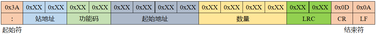 虽然Modbus ASCII与Modbus RTU都是基于串行链路来实现的,但在数据传输的报文格式上存在较大区别。相比于Modbus RTU,Modbus ASCII采用ASCII码的形式来发送报文,并且有确定的起始字符和结束字符。具体结构如下: