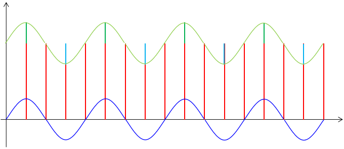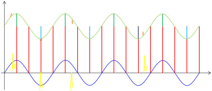 首先我们来考虑相对频率较低的周期干扰,这种干扰来自于环境并且很难避免,但这种干扰信号具有一定的规律,所以它对正常信号造成的影响也是有一定规律的。我们可以图示如下: