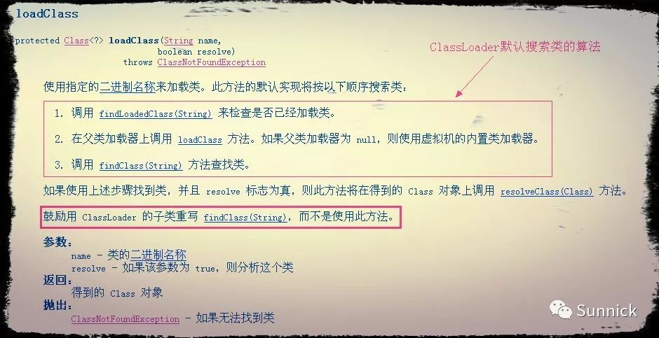 因为JDK已经在loadClass方法中帮我们实现了ClassLoader搜索类的算法,当在loadClass方法中搜索不到类时,loadClass方法就会调用findClass方法来搜索类,所以我们只需重写该方法即可。如没有特殊的要求,一般不建议重写loadClass搜索类的算法。下图是API中ClassLoader的loadClass方法: