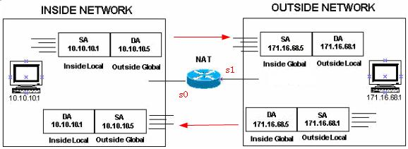 这是一个简单的NAT转换示例。要实现以下目的:当NAT路由器的内部网络s0接口上接收到一个源地址为内部本地地址10.10.10.1,目的IP地址为外部本地地址171.16.68.1的数据包时,在转发到s1接口时,原来数据包源地址的内部本地地址10.10.10.1被转换成内部全局地址171.16.68.5,但目的地址不变,然后继续发送。在这个过程中,所进行的只是数据包中源IP地址的转换,由内部本地地址向内部全局地址转换,且只是内部地址之间的转换。