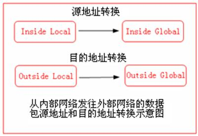 总体来说,NAT进行地址转换的过程就是“本地地址”与“全局地址”之间的转换过程,无论数据包是从内部网络发往外部网络,还是从外部网络发往内部网络。不同的只是本地地址和全局地址所对应的网络不同,以及数据包重新封装的源和目的地址不同。具体如图所示。