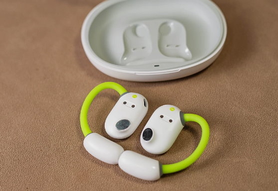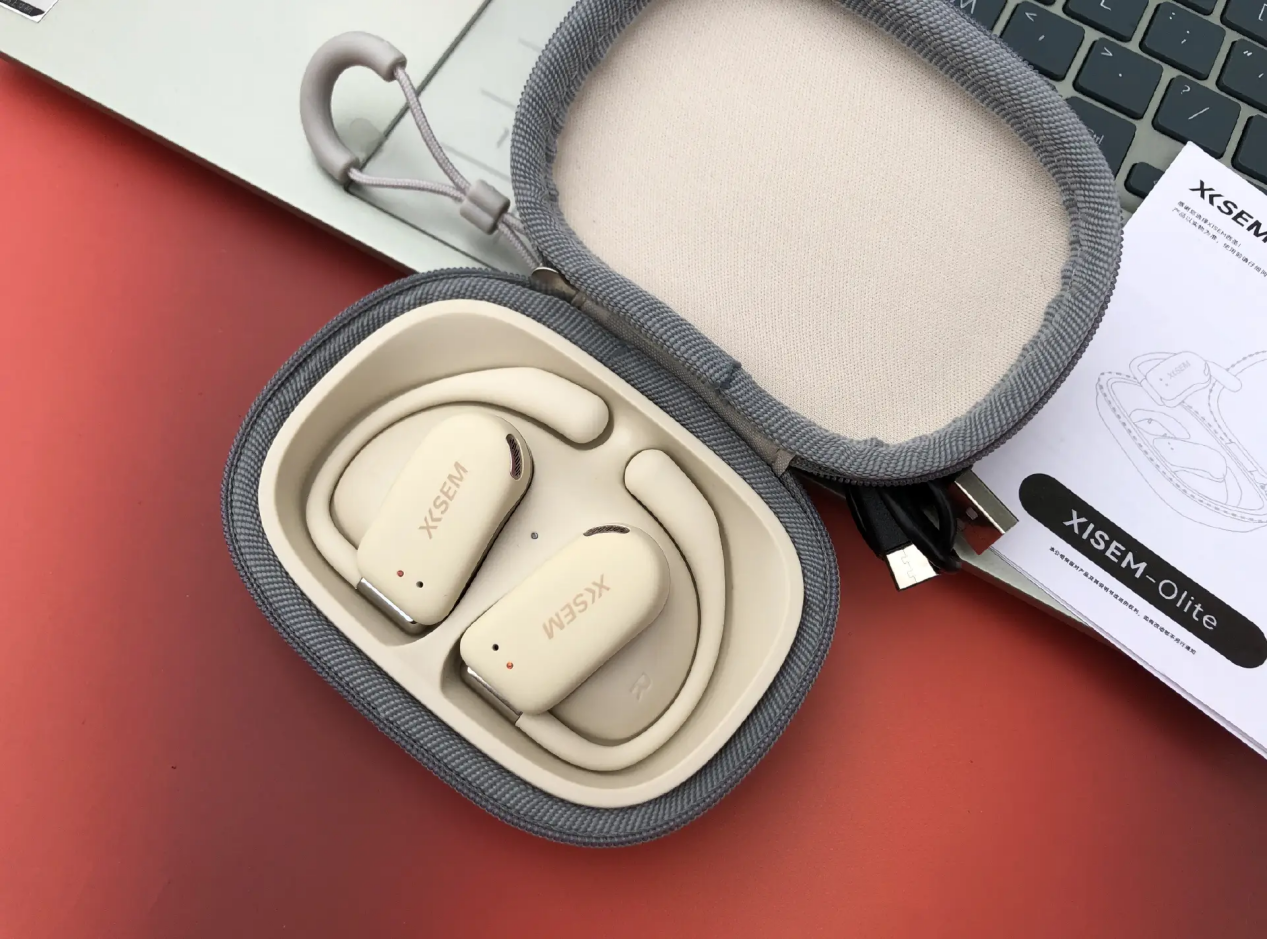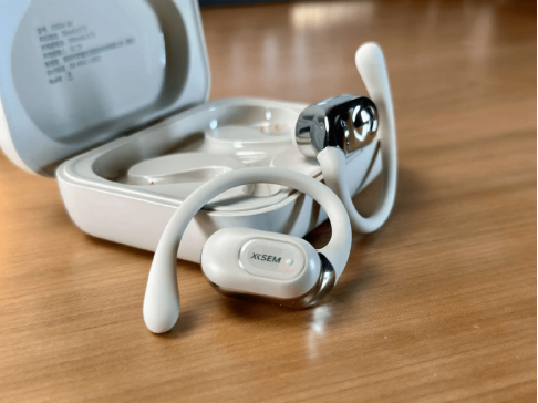 这款耳机拥有比较漂亮的弧度透明充电仓顶盖且顶盖手感滑润,下面是细致磨砂触感。耳机佩戴的方法也比较简单,把耳挂挂上耳朵,然后旋转调整一下,让耳机本体保持倾斜向上的状态即可,对戴眼镜的人士也是比较友好的。音质方面,其内部搭载空气定向传导喇叭,整体质感自然饱满,干净明朗,但低频表现不足。续航方面,单向续航7.5个小时,加上充电盒能坚持30个小时,实测下来还挺准的。