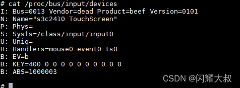 值得注意的是 B 位图,比如上图中“ B: EV=b”用来表示该设备支持哪类输入事件。 b 的二进制是 1011, bit0、 1、 3 为 1,表示该设备支持 0、 1、 3 这三类事件,即 EV_SYN、 EV_KEY、 EV_ABS。