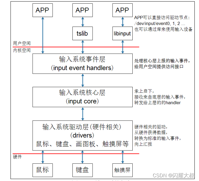 Linux 系统为了统一管理这些输入设备,实现了一套能兼容所有输入设备的框架:输入系统。驱动开发人员基于这套框架开发出程序,应用开发人员就可以使用统一的 API 去使用设备。