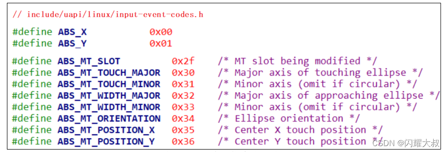 | EV_ABS | 0x03 | 绝对坐标(如:触摸屏或操作杆,报告绝对的坐标位置) |