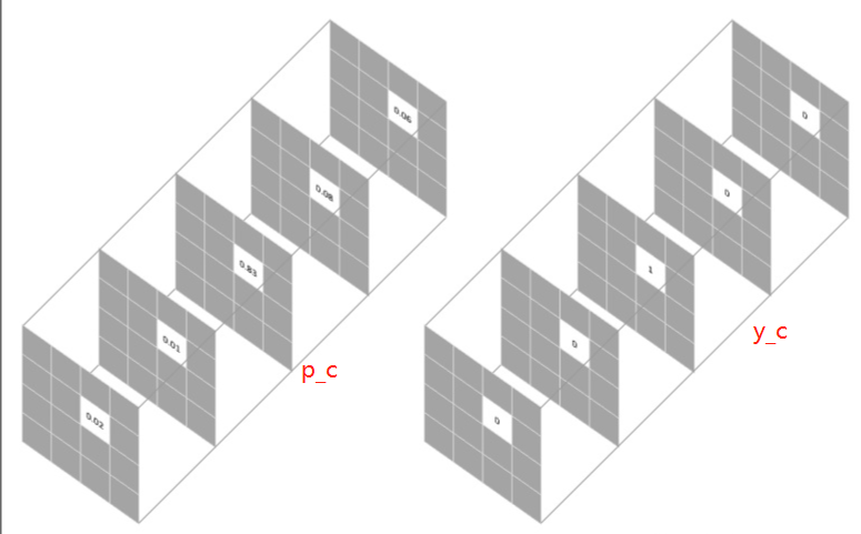 其中, M M M代表类别数, y c y_c yc是one-hot向量,元素只有 0 0 0 和 1 1 1 两种取值,至于 p c p_c pc表示预测样本属于 c c c 类别的概率。假设我们需要对每个像素的预测类别有5个,则预测的概率分布向量长度为5: