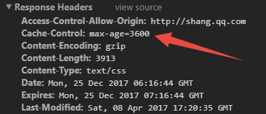 max-age(单位为s)指定设置缓存最大的有效时间,定义的是时间长短。当浏览器向服务器发送请求后,在max-age这段时间里浏览器就不会再向服务器发送请求了。我们来找个资源看下。比如QQ推广上的css资源,max-age=3600,也就是说缓存有效期为3600秒(也就是1h)。于是在1天内都会使用这个版本的资源,即使服务器上的资源发生了变化,浏览器也不会得到通知。max-age会覆盖掉Expires,后面会有讨论