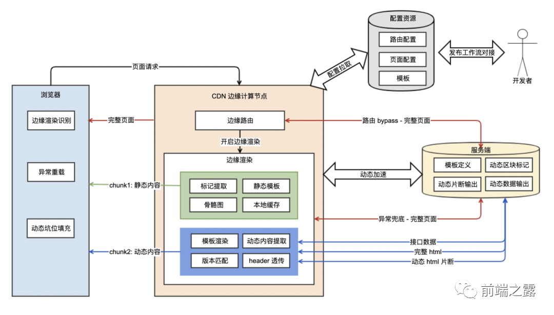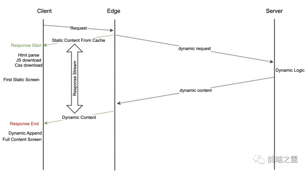 CDN 比服务端距离用户更近,有更短的网络延时。在CDN节点上将可缓存的页面静态部分先快速返回给用户,同时在CDN节点上发起动态部分内容请求,并将动态内容在静态部分的响应流后,继续返回给用户。