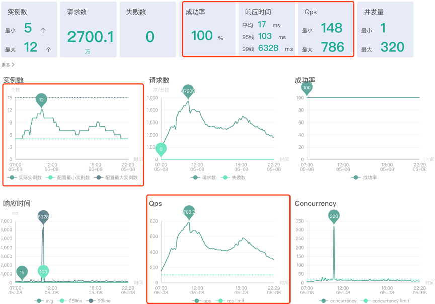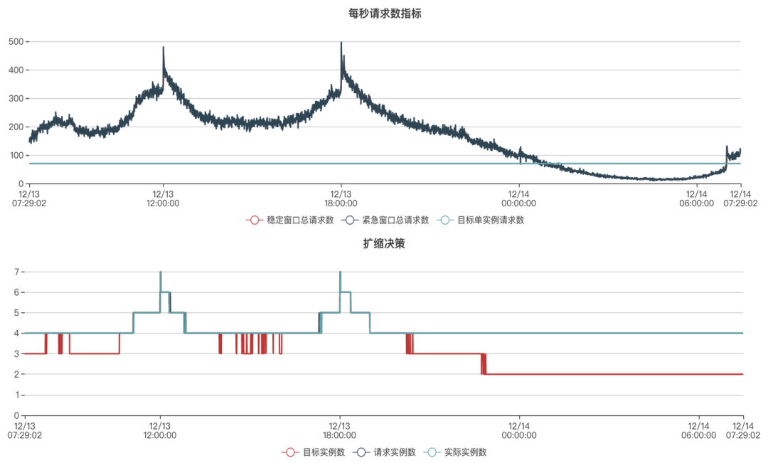 下图展示的是线上弹性伸缩的真实案例(配置的最小实例数为4,单实例阈值100,阈值使用率0.7),其中上半部分是业务每秒的请求数,下半部分是扩缩实例的决策图,可以看到在成功率100%的情况下,业务完美应对流量高峰。